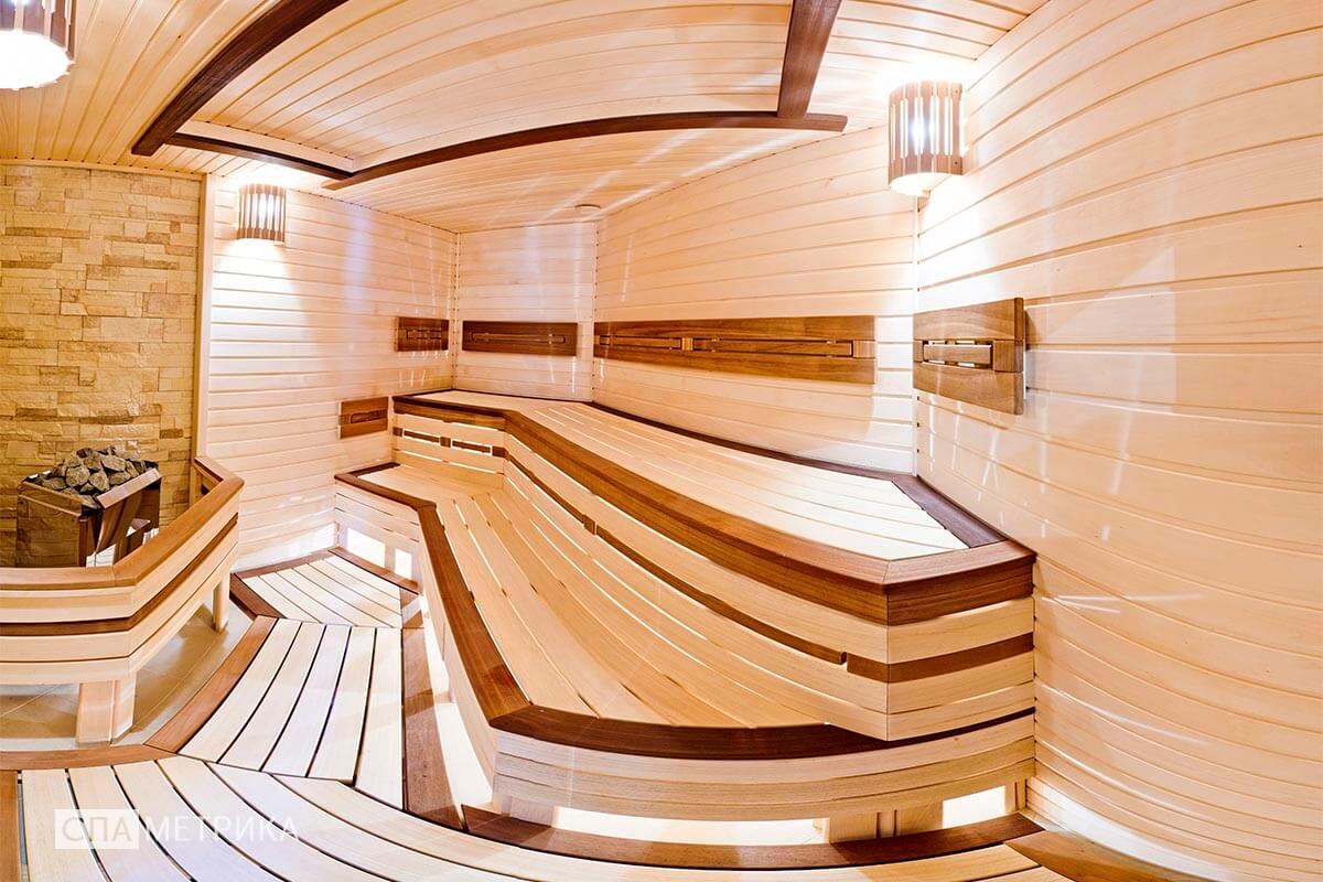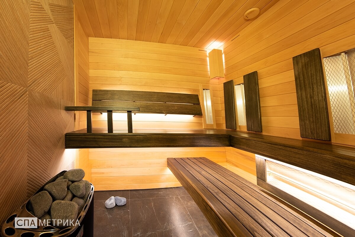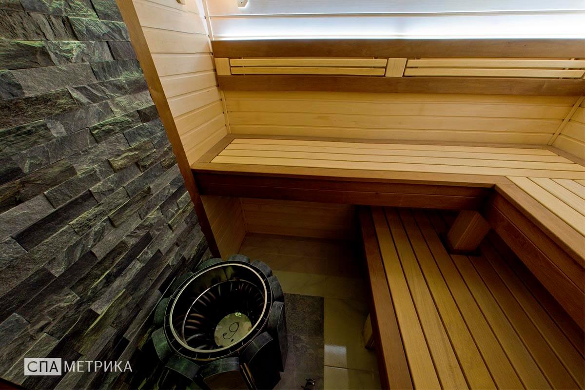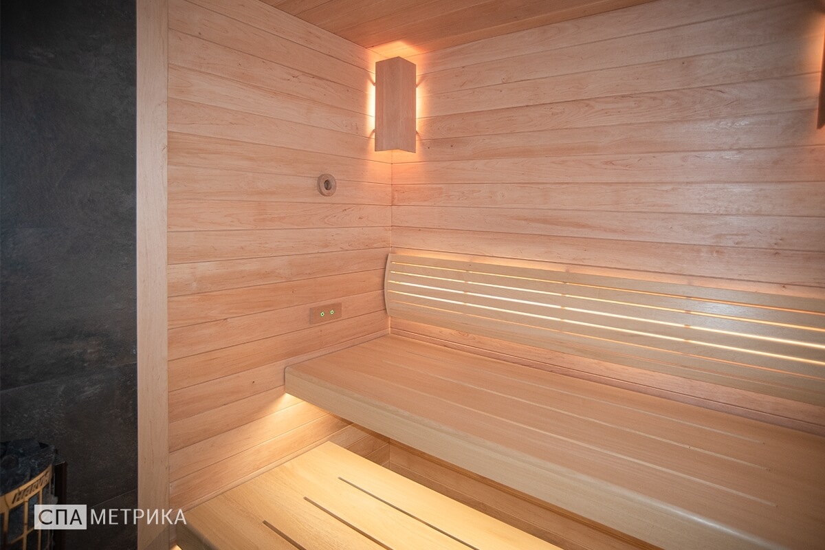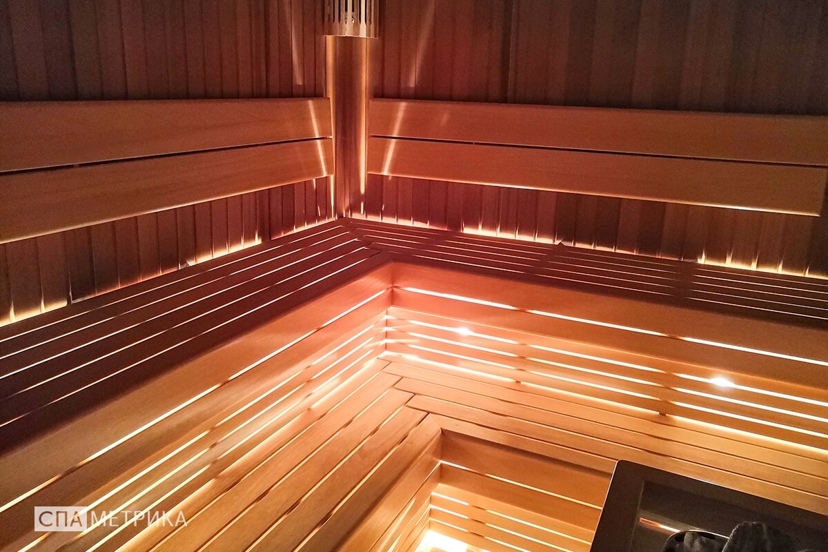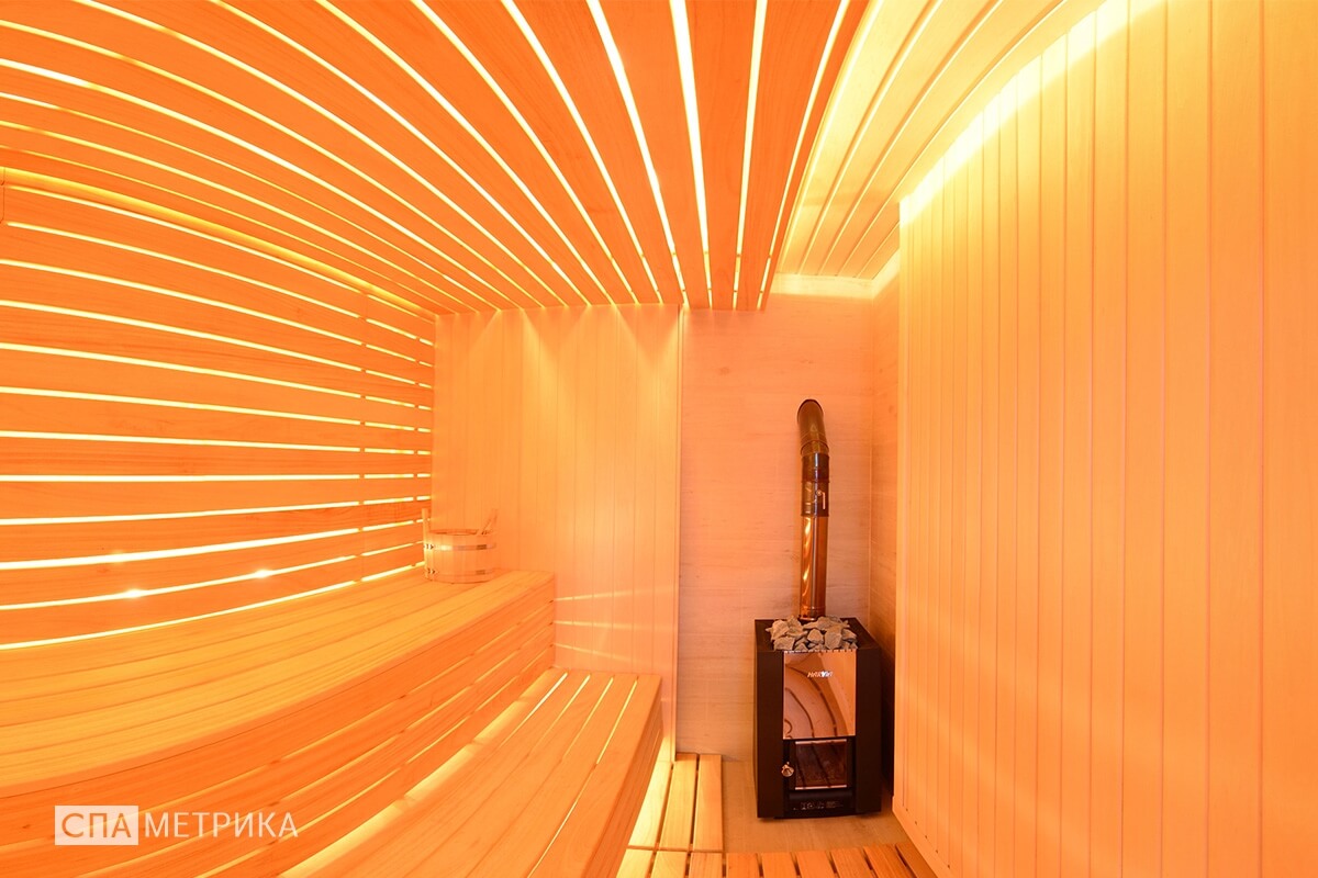 - Освещение — светильники Harvia с авторскими абажурами, LED под полками.
